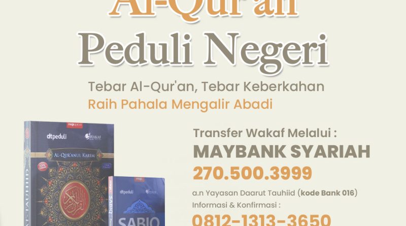 Kini Lembaga Wakaf Daarut Tauhiid Peduli juga bergerak dalam menyelenggarakan Program Wakaf Quran, yang telah menyalurkan banyak mushaf al-Quran ke berbagai masjid di berbagai kota dan kabupaten di Indonesia. Dengan Rp.150.000, kita bisa berwakaf al quran + buku panduan sabiq. donasi sudah termasuk pendistribusian dan pengajaran al quran. Bagi sahabat-sahabat ingin berwakaf silahkan menghubungi dan mengunjungi kantor bagian wakaf Daarut Tauhiid.